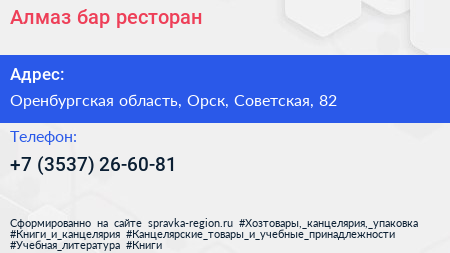 Алмаз, бар-ресторан по адресу Оренбургская область, Орск, Советская, 82 в дальнейшем Организация, размещена в следующих категориях: