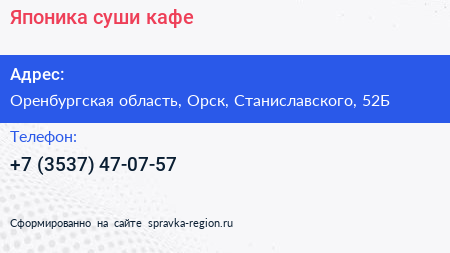 Японика, суши-кафе по адресу Оренбургская область, Орск, Станиславского, 52Б в дальнейшем Организация, размещена в следующих категориях: