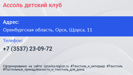 Ассоль, детский клуб по адресу Оренбургская область, Орск, Щорса, 11 в дальнейшем Организация, размещена в следующих категориях: