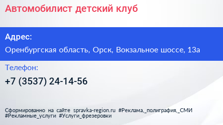 Автомобилист, детский клуб по адресу Оренбургская область, Орск, Вокзальное шоссе, 13а в дальнейшем Организация, размещена в следующих категориях: