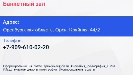 Банкетный зал по адресу Оренбургская область, Орск, Крайняя, 44/2 в дальнейшем Организация, размещена в следующих категориях: