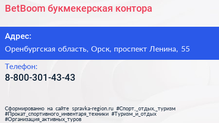 BetBoom, букмекерская контора по адресу Оренбургская область, Орск, проспект Ленина, 55 в дальнейшем Организация, размещена в следующих категориях: