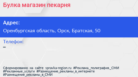 Булка, магазин-пекарня по адресу Оренбургская область, Орск, Братская, 50 в дальнейшем Организация, размещена в следующих категориях: