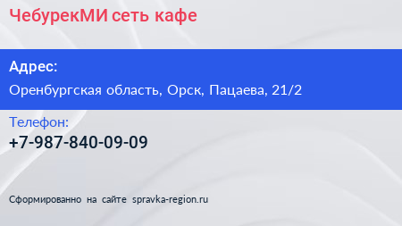 ЧебурекМИ, сеть кафе по адресу Оренбургская область, Орск, Пацаева, 21/2 в дальнейшем Организация, размещена в следующих категориях: