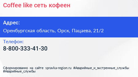 Coffee like, сеть кофеен по адресу Оренбургская область, Орск, Пацаева, 21/2 в дальнейшем Организация, размещена в следующих категориях: