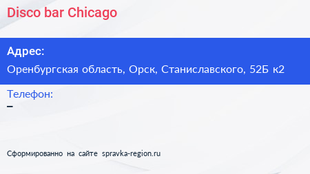 Disco-bar Chicago по адресу Оренбургская область, Орск, Станиславского, 52Б к2 в дальнейшем Организация, размещена в следующих категориях:
