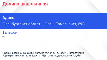 Долина, шашлычная по адресу Оренбургская область, Орск, Гомельская, 69Б в дальнейшем Организация, размещена в следующих категориях: