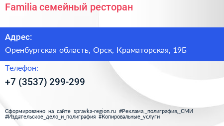 Familia, семейный ресторан по адресу Оренбургская область, Орск, Краматорская, 19Б в дальнейшем Организация, размещена в следующих категориях: