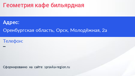 Геометрия, кафе-бильярдная по адресу Оренбургская область, Орск, Молодёжная, 2а в дальнейшем Организация, размещена в следующих категориях: