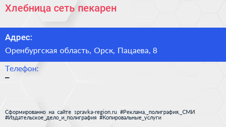 Хлебница, сеть пекарен по адресу Оренбургская область, Орск, Пацаева, 8 в дальнейшем Организация, размещена в следующих категориях: