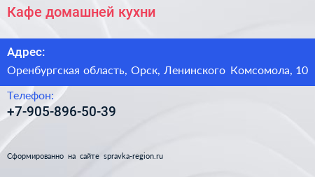 Кафе домашней кухни по адресу Оренбургская область, Орск, Ленинского Комсомола, 10 в дальнейшем Организация, размещена в следующих категориях: