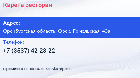 Карета, ресторан по адресу Оренбургская область, Орск, Гомельская, 43а в дальнейшем Организация, размещена в следующих категориях: