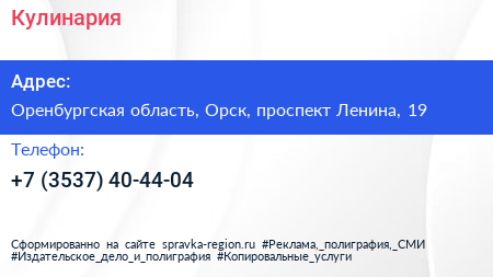 Кулинария по адресу Оренбургская область, Орск, проспект Ленина, 19 в дальнейшем Организация, размещена в следующих категориях: