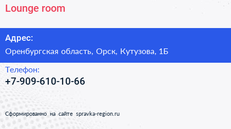 Lounge room по адресу Оренбургская область, Орск, Кутузова, 1Б в дальнейшем Организация, размещена в следующих категориях: