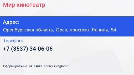 Мир, кинотеатр по адресу Оренбургская область, Орск, проспект Ленина, 54 в дальнейшем Организация, размещена в следующих категориях: