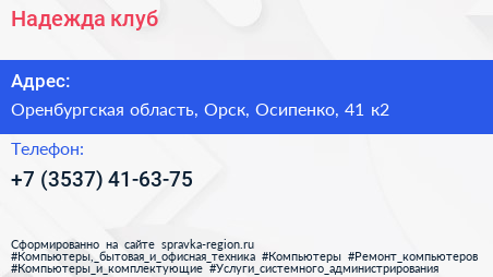 Надежда, клуб по адресу Оренбургская область, Орск, Осипенко, 41 к2 в дальнейшем Организация, размещена в следующих категориях:
