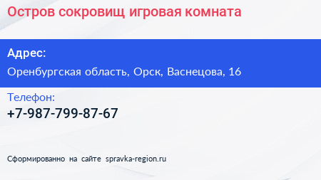 Остров сокровищ, игровая комната по адресу Оренбургская область, Орск, Васнецова, 16 в дальнейшем Организация, размещена в следующих категориях: