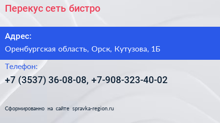 Перекус, сеть бистро по адресу Оренбургская область, Орск, Кутузова, 1Б в дальнейшем Организация, размещена в следующих категориях: