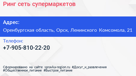 Ринг, сеть супермаркетов по адресу Оренбургская область, Орск, Ленинского Комсомола, 21 в дальнейшем Организация, размещена в следующих категориях: