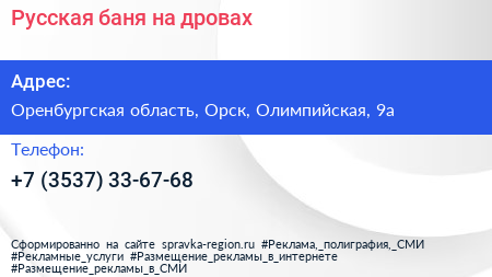 Русская баня на дровах по адресу Оренбургская область, Орск, Олимпийская, 9а в дальнейшем Организация, размещена в следующих категориях: