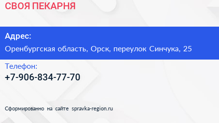 СВОЯ ПЕКАРНЯ по адресу Оренбургская область, Орск, переулок Синчука, 25 в дальнейшем Организация, размещена в следующих категориях: