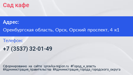 Сад, кафе по адресу Оренбургская область, Орск, Орский проспект, 4 к1 в дальнейшем Организация, размещена в следующих категориях: