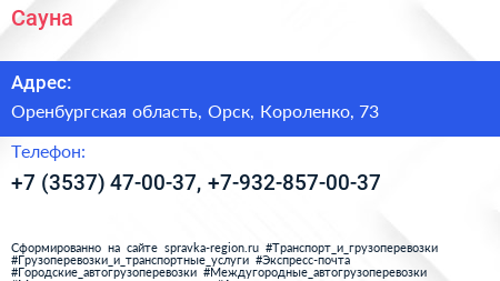 Сауна по адресу Оренбургская область, Орск, Короленко, 73 в дальнейшем Организация, размещена в следующих категориях: