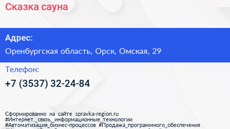 Сказка, сауна по адресу Оренбургская область, Орск, Омская, 29 в дальнейшем Организация, размещена в следующих категориях: