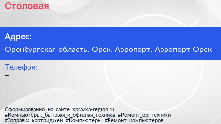 Столовая по адресу Оренбургская область, Орск, Аэропорт, Аэропорт-Орск в дальнейшем Организация, размещена в следующих категориях: