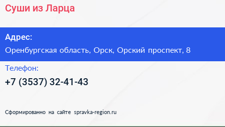 Суши из Ларца по адресу Оренбургская область, Орск, Орский проспект, 8 в дальнейшем Организация, размещена в следующих категориях: