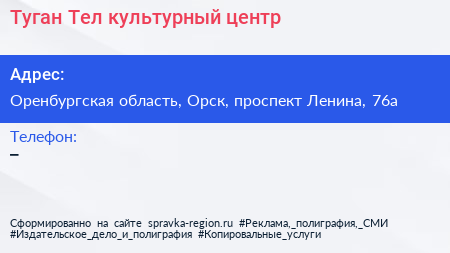 Туган-Тел, культурный центр по адресу Оренбургская область, Орск, проспект Ленина, 76а в дальнейшем Организация, размещена в следующих категориях: