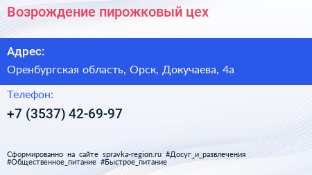 Возрождение, пирожковый цех по адресу Оренбургская область, Орск, Докучаева, 4а в дальнейшем Организация, размещена в следующих категориях: