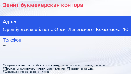Зенит, букмекерская контора по адресу Оренбургская область, Орск, Ленинского Комсомола, 10 в дальнейшем Организация, размещена в следующих категориях: