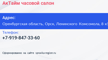 АкТайм, часовой салон по адресу Оренбургская область, Орск, Ленинского Комсомола, 8 к1 в дальнейшем Организация, размещена в следующих категориях:
