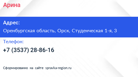 Арина по адресу Оренбургская область, Орск, Студенческая 1-я, 3 в дальнейшем Организация, размещена в следующих категориях: