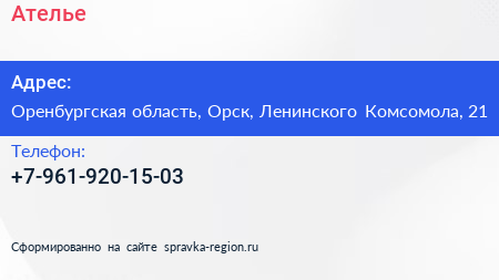 Ателье по адресу Оренбургская область, Орск, Ленинского Комсомола, 21 в дальнейшем Организация, размещена в следующих категориях: