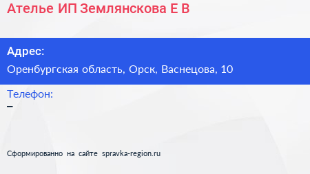 Ателье, ИП Землянскова Е.В. по адресу Оренбургская область, Орск, Васнецова, 10 в дальнейшем Организация, размещена в следующих категориях: