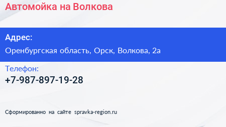 Автомойка на Волкова по адресу Оренбургская область, Орск, Волкова, 2а в дальнейшем Организация, размещена в следующих категориях: