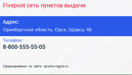 Fivepost, сеть пунктов выдачи по адресу Оренбургская область, Орск, Щорса, 4Б в дальнейшем Организация, размещена в следующих категориях: