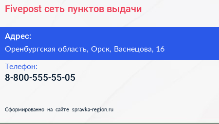 Fivepost, сеть пунктов выдачи по адресу Оренбургская область, Орск, Васнецова, 16 в дальнейшем Организация, размещена в следующих категориях: