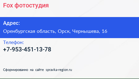 Fox, фотостудия по адресу Оренбургская область, Орск, Чернышева, 16 в дальнейшем Организация, размещена в следующих категориях: