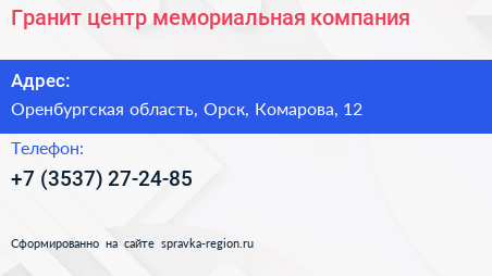 Гранит-центр, мемориальная компания по адресу Оренбургская область, Орск, Комарова, 12 в дальнейшем Организация, размещена в следующих категориях: