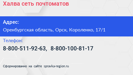 Халва, сеть почтоматов по адресу Оренбургская область, Орск, Короленко, 17/1 в дальнейшем Организация, размещена в следующих категориях: