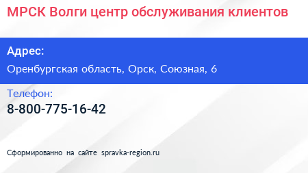 МРСК Волги, центр обслуживания клиентов по адресу Оренбургская область, Орск, Союзная, 6 в дальнейшем Организация, размещена в следующих категориях: