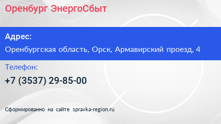 Оренбург ЭнергоСбыт по адресу Оренбургская область, Орск, Армавирский проезд, 4 в дальнейшем Организация, размещена в следующих категориях: