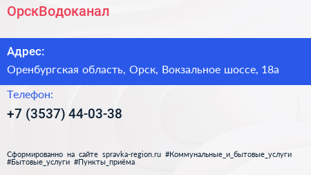ОрскВодоканал по адресу Оренбургская область, Орск, Вокзальное шоссе, 18а в дальнейшем Организация, размещена в следующих категориях: