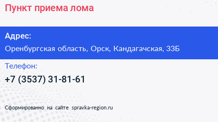 Пункт приема лома по адресу Оренбургская область, Орск, Кандагачская, 33Б в дальнейшем Организация, размещена в следующих категориях:
