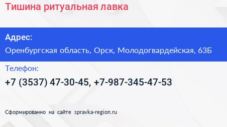 Тишина, ритуальная лавка по адресу Оренбургская область, Орск, Молодогвардейская, 63Б в дальнейшем Организация, размещена в следующих категориях: