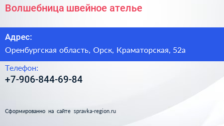 Волшебница, швейное ателье по адресу Оренбургская область, Орск, Краматорская, 52а в дальнейшем Организация, размещена в следующих категориях: