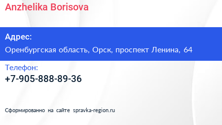 Anzhelika Borisova по адресу Оренбургская область, Орск, проспект Ленина, 64 в дальнейшем Организация, размещена в следующих категориях: